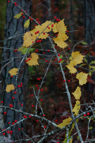 I love how these muscadine grape leaves made a golden arch around some red possumhaw berries.