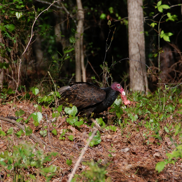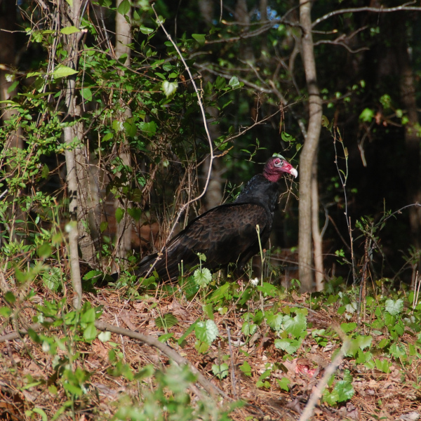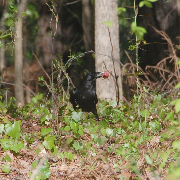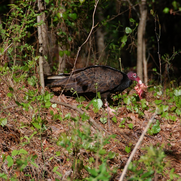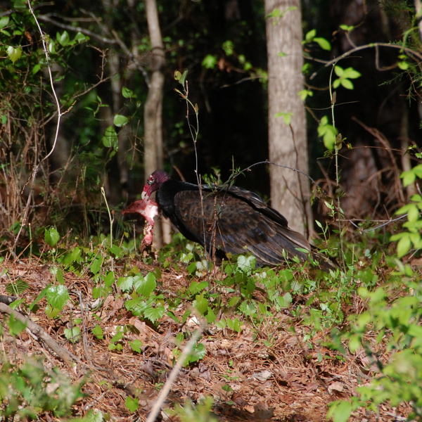 Apparently, someone threw a large piece of meat (it looked like pork to me) out there. The vulture had quite a feast! It stayed for about 30 minutes. We watched as it picked up pieces of meat, carried it to a spot a little deeper in the trees, had a few bites, and then went back out to get another piece and repeat the process. It flew away before all the meat was gone. And then when the coast was clear, a large crow flew in, grabbed a small piece of meat, and flew away again.